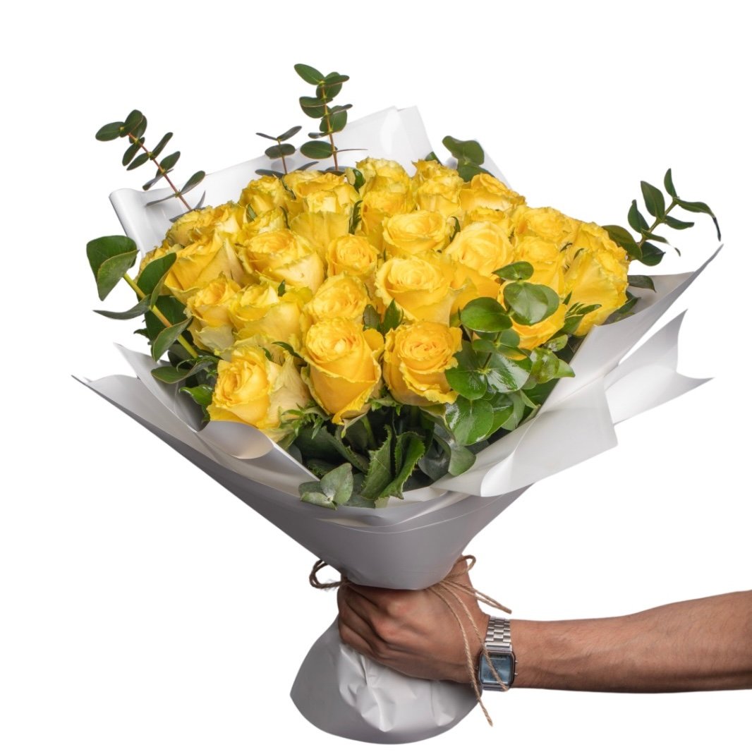تنسيق مشرق من الورد الأصفر مع الإكليبتس، يعكس طاقة إيجابية وإحساس بالبهجة.