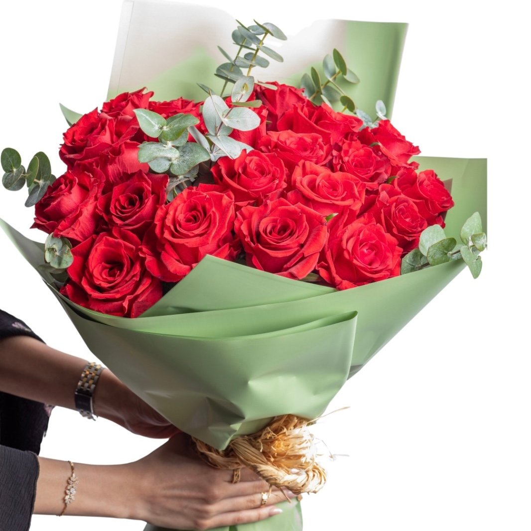 بوكيه ورد أحمر بتنسيق كلاسيك يعبر عن الحب والمشاعر القوية.