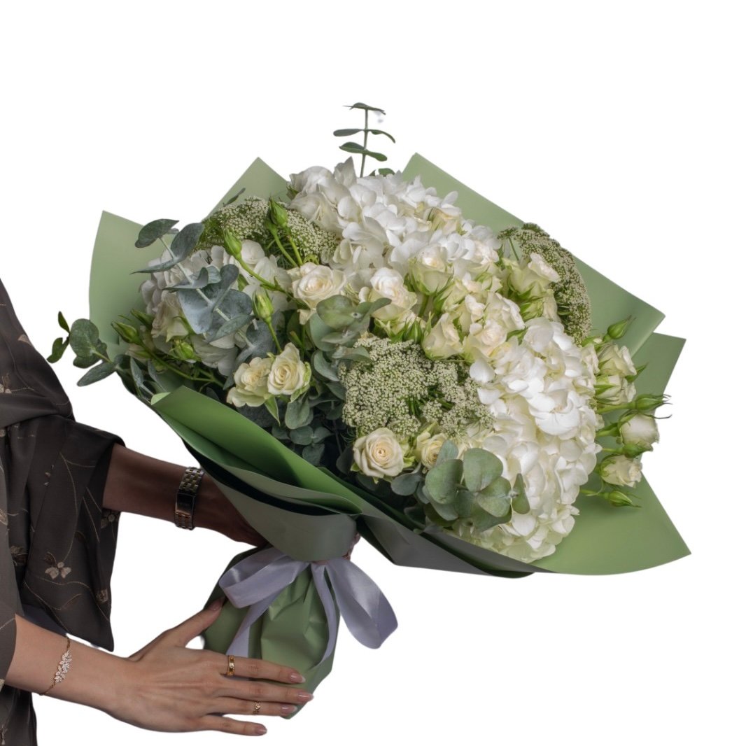 تنسيق هادي يجمع بين الهدرينجا والبيبي روز الأبيض بلمسة طبيعية أنيقة.