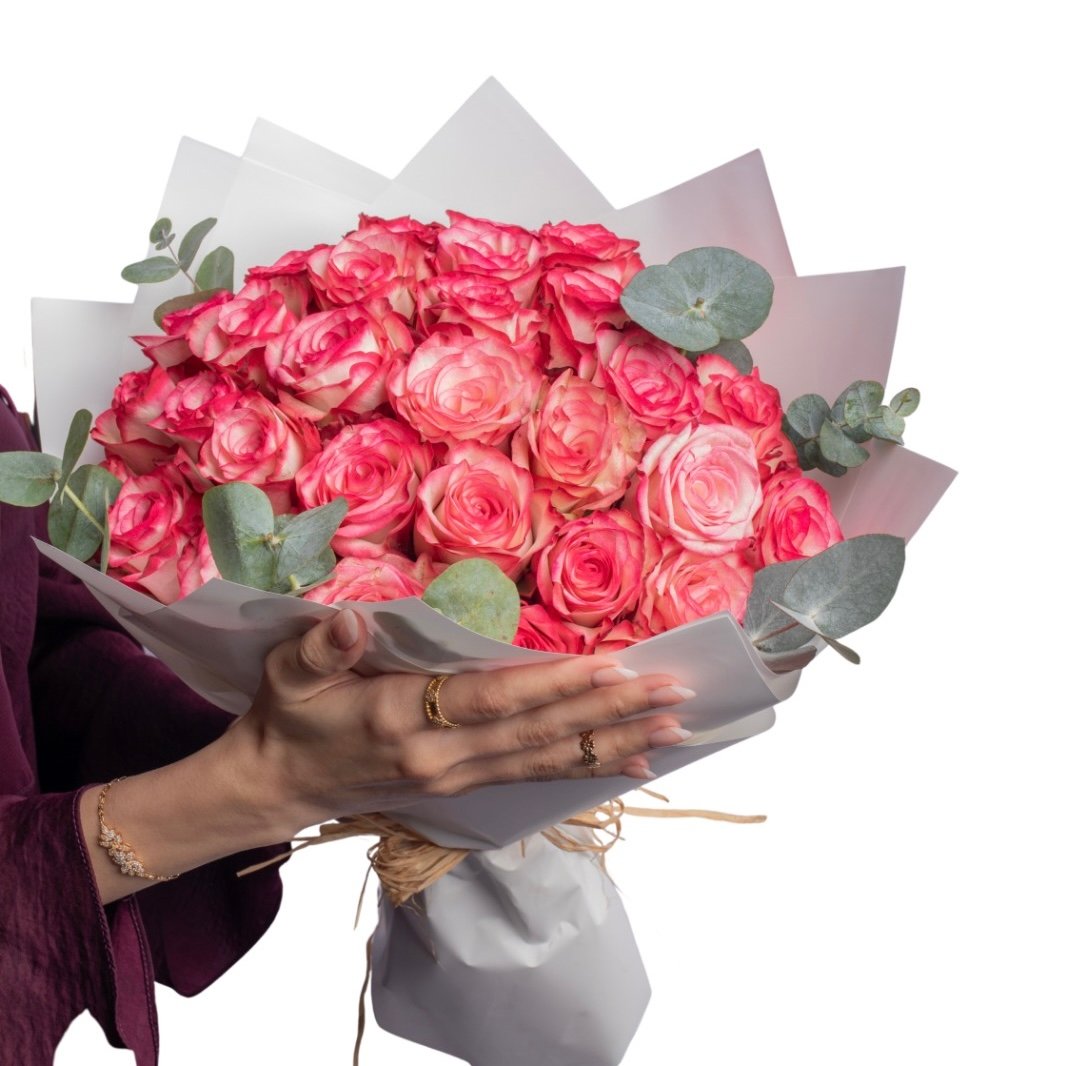 بوكيه فاخر مكوّن من 50 وردة روز بينك، تنسيق ناعم مليان إحساس يعبر عن المشاعر الدافئة والحب.