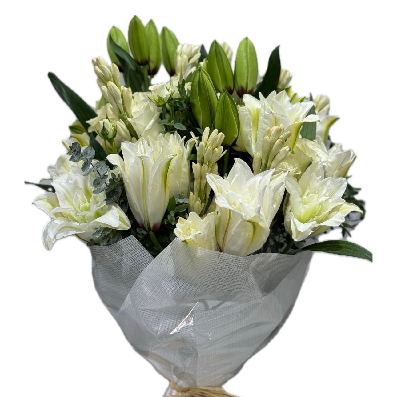بوكيه ليليوم أبيض بتنسيق راقي يناسب الذوق الهادئ.